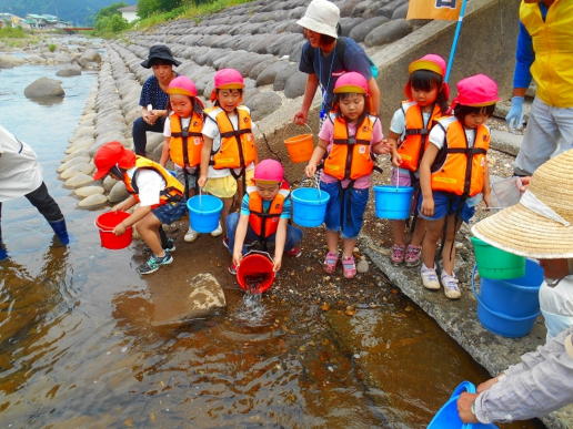 放流に合わせて、石沢・由利・矢島・鳥海の各地区では保育園児・学童による体験放流も行われました。