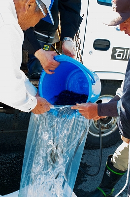 当日、子吉川水系河川で捕獲した親魚から卵を採取し潟上市で育てられたサクラマス稚魚3万5千尾が管内6地区の中上流河川に放流されました。