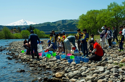 晴天に恵まれたこの日は由利地区の西滝沢水辺プラザで地域の児童による体験放流も行われ、冠雪で真っ白な鳥海山を背景に子供たちの元気な歓声が響いていました。