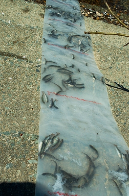 稚魚は体調6㎝、2.5グラムほどに成長、水温は中流域で8℃から11℃ほどと適温で元気に流れの間に消えていきました。