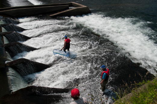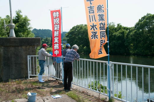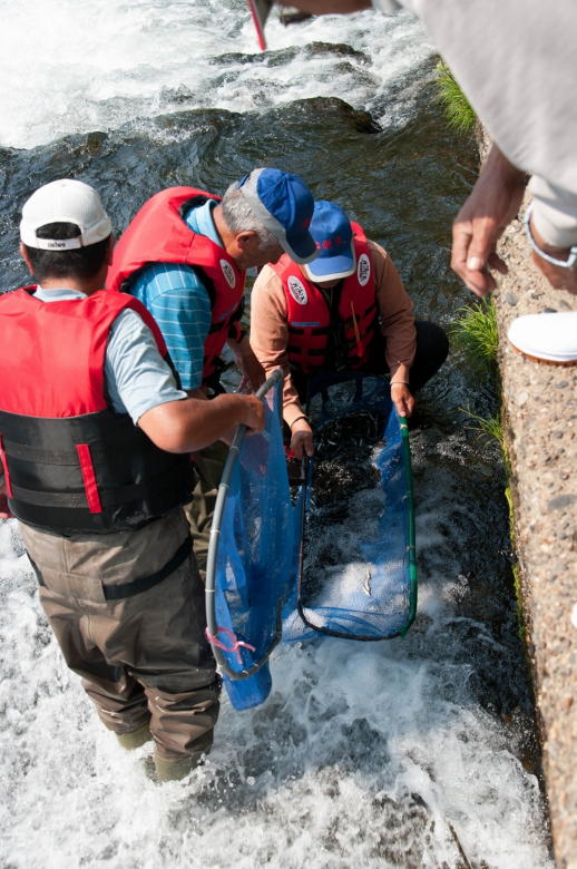 事業河川 あゆ放流整備 アユのくみ上げ放流 事業アユのくみ上げ放流 2025.04.072025.04.14 この記事は約1分で読めます。 平成29年6月20日 矢島地区でアユのくみ上げ放流が行われました。 堰堤に阻まれ遡上できないでいるアユを網で掬い取り堰堤の上流部に放流するもので、流域全体にアユを行き渡らせるために行うもので、この日の作業では天然アユと思われる15kgほどのアユが堰堤上流に放流されました。この作業は解禁前の6月中に合計10回ほど行われます。 アユのくみ上げ放流