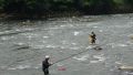 両日ともに組合員・漁場監視員など数名が参加、水量が多く流れが急なため足をすくわれないように注意しながら網を入れ掬い取られてずっしりと重いアユの群れを堰堤の下流から上流に汲み上げます。