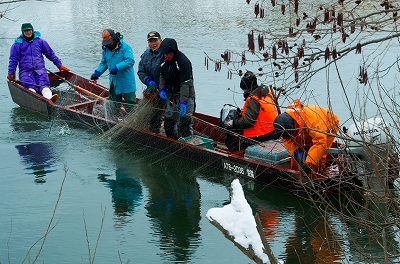 今冬は暖冬で雪も少なめなもののこの数日間は急に冷え込みが厳しく当日の気温は-2℃、水温2℃ほど、ゴム手袋のなかの指も悴むほどの寒さのなかで地元ケーブルテレビや首都圏からのお客様を迎えての漁でしたが、数日来の雨で水量が多いことに加え落ち葉等の混入もひどく残念ながら収穫は芳しくなかったものの、各地区の冬季の重要な行事でもあり粉雪の混じる寒風にさらされながら久しぶりの漁の感触を楽しんでいました。