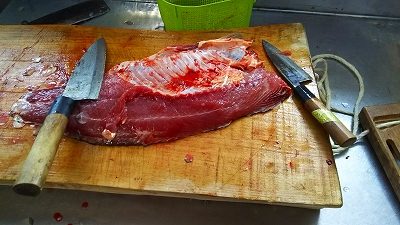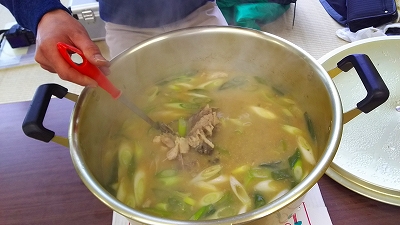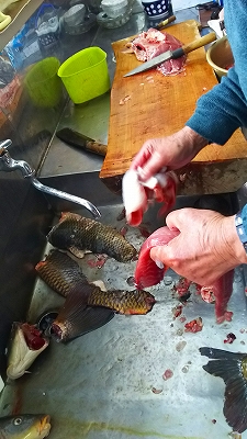 漁を終えた後、地元の公民館で獲れたコイを調理、温水につけて湯洗い後に氷水で冷やした寒鯉はくせもなくコリコリとした歯触りのコイのあらいや地元産の美味しい白味噌で味付けをした鍋は絶品、舌鼓を打ち地酒でのどを潤しながらの楽しい歓談で暗くなるまで雪の合間のひと時を楽しみました。
