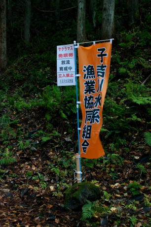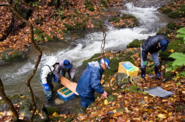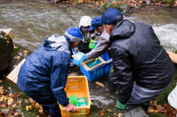 当日は周囲の山々が今年初めて雪化粧し、雨混じりの気温6℃、水温7.5℃とあいにくの天候でしたが、午前10時に石沢ウッディホールに集合、打ち合わせののち放流現場である子吉川支流の石沢川の沢に移動、県内水面漁連関係者の指導のもと、川床を整備したのち発眼卵の入った容器をコンテナ2個に納めて埋設、2時間ほどで作業を終了しました。