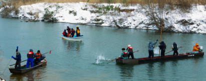 暖冬だった今年も2.3日前からの寒波により雪の舞うこの日、子吉地区組合員により子吉川と堺川の合流点付近で3艘の川船に乗り込んで伝統漁法であるコイの追い込み漁がおこなわれました。
