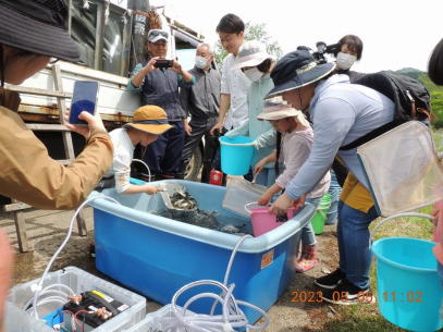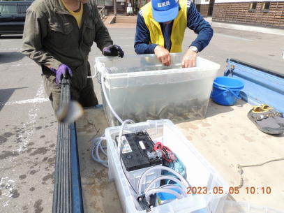 事業河川 サクラマス体験放流育成 サクラマス放流 事業 2025.04.082025.04.14 この記事は約1分で読めます。 令和5年5月5日:第1回目のサクラマス放流 サクラマスの今年度第1回目の放流が行われました。 今年度は養殖業者の関係で2度の放流を実施することになり、今回は計画した3.5万尾のうち、3地区に1万尾を放流しました。 手づくりの2基の酸素供給装置も活躍しています。 このうち、由利地区では西滝沢水辺プラザにおいて子供たちの体験放流を実施、放流した稚魚の元気に泳ぐ姿にかわいい歓声が上がっていました。 第2回目の放流は今月下旬ころの見込みです。