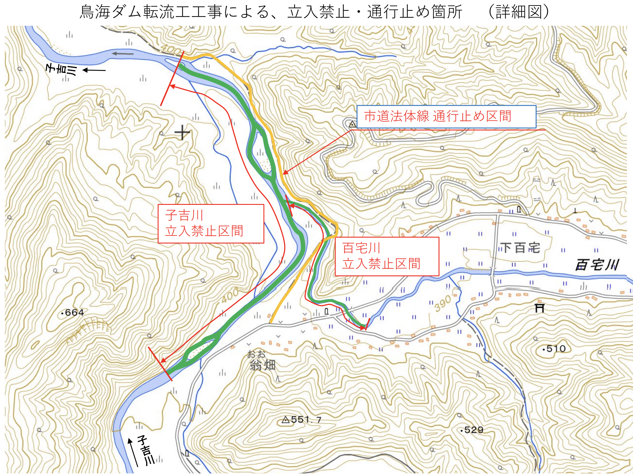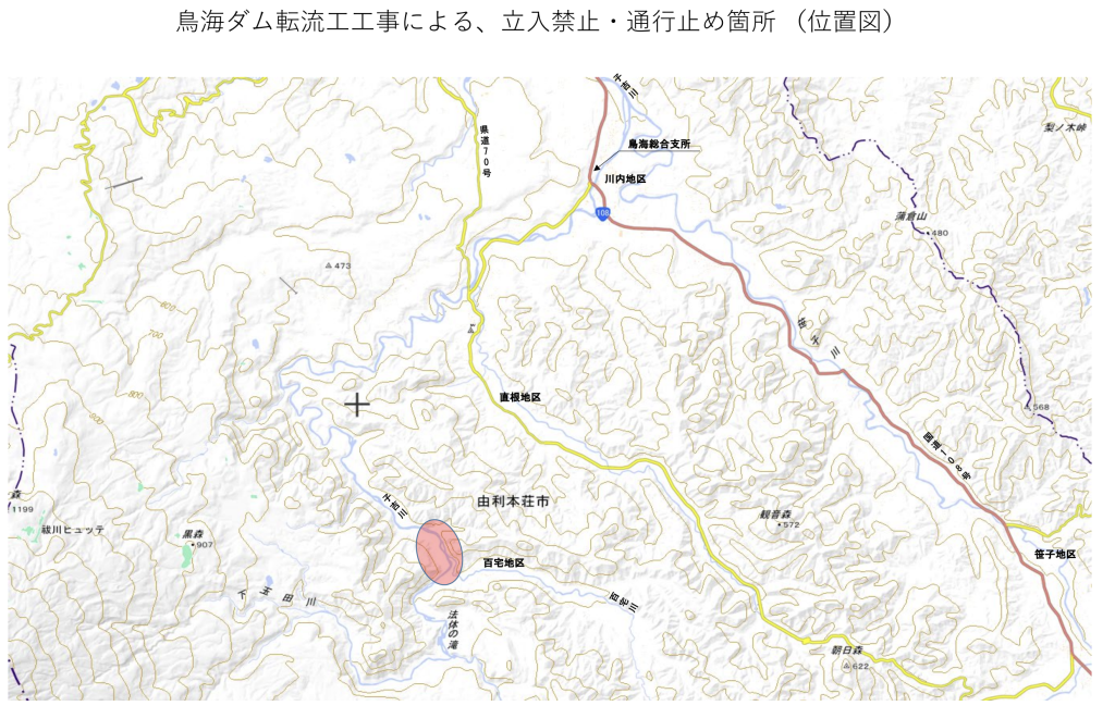 ご案内河川 お知らせ安全確保鳥海ダム 通行止め・立ち入り禁止個所 ご案内 2025.04.082025.08.25 この記事は約1分で読めます。 R3年3月19日:鳥海ダム工事事務所より河川内立ち入り禁止等のお知らせ 鳥海ダム工事事務所よりダム転流工工事の開始にともない鳥海町百宅地内の現場周辺に通行止め、立ち入り禁止の措置がとられたとの情報がありました。 通行止めは鳥海ダムのダム建設予定地付近の市道法体線の一部、立ち入り禁止個所は工事現場の河川で、実施日は3月15日からとなっています。 なお、渓流魚の解禁日は4月1日ですが、現場はまだ雪が多く立ち入り禁止区域外であってもいまだかなりの積雪がありますのでご注意ください。 ※ 規制地図